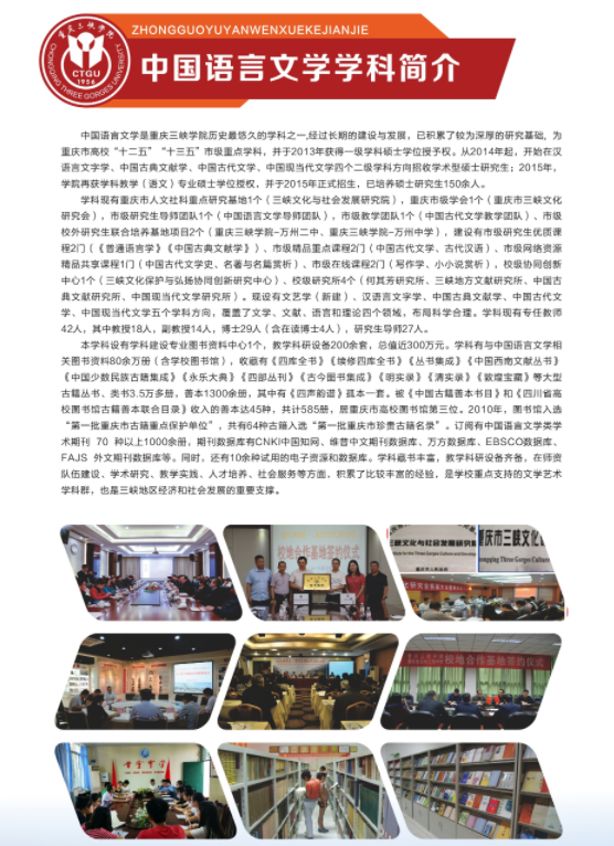 接教育部、国务院学位委员会通知,太阳成集团tyc7111cc中国语言文学一级学科硕士学位授权点于2020年9月通过复评验收,将于2021年恢复招生。本学位授权点经过进一步建设和发展,学科优势明显、学科特色鲜明,学科连续获评重庆市“十二五”、“十三五”重点学科。本学位授权点学科方向增至5个,包括:文艺学、汉语言文字学、中国古典文献学、中国古代文学、中国现当代文学。热忱欢迎有志于学术和进一步深造的海内外学子报考和加盟!