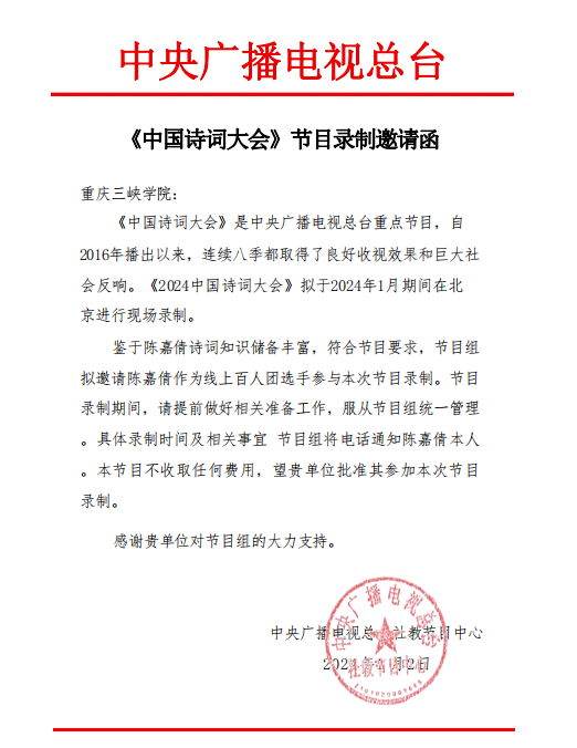 近日,太阳成集团tyc7111cc传来喜讯,2021级汉语言文学(师范)4班的陈嘉倩同学成功入选《2024中国诗词大会》线上百人团。“中国诗词大会”是一档由中央广播电视总台原创的大型文化节目,节目以“赏诗词之美、寻文化之根、铸民族之魂”为理念,唤起人民群众对传统诗词文化的浓厚兴趣,在全国范围内掀起了广大诗词爱好者学习的热潮。