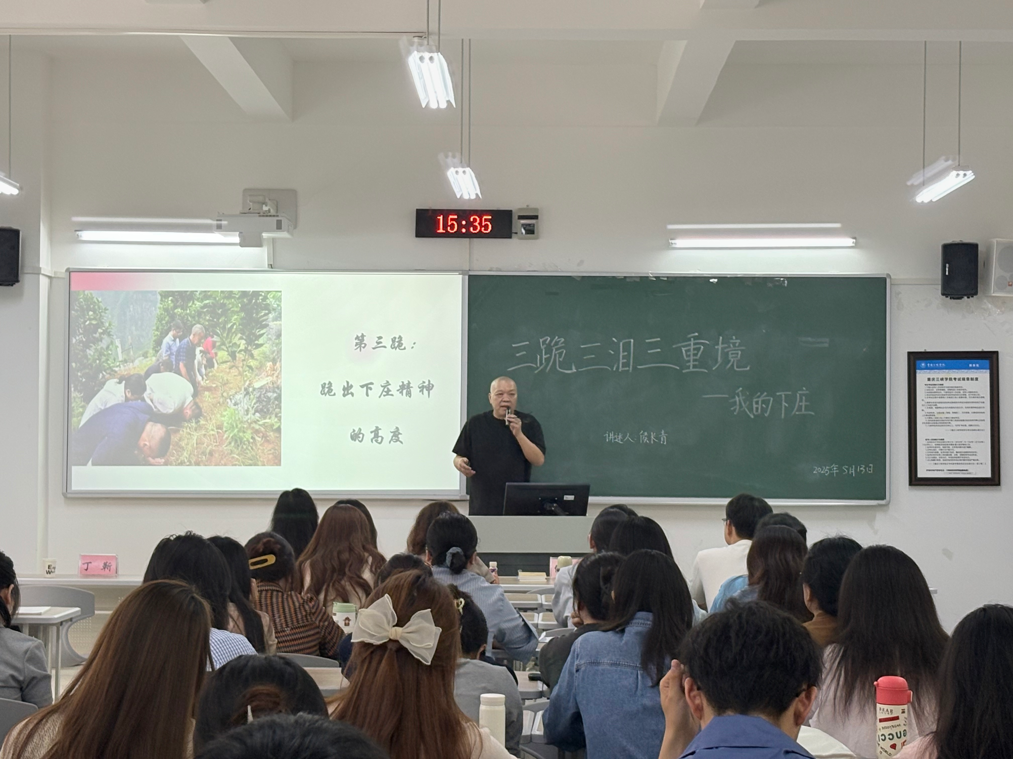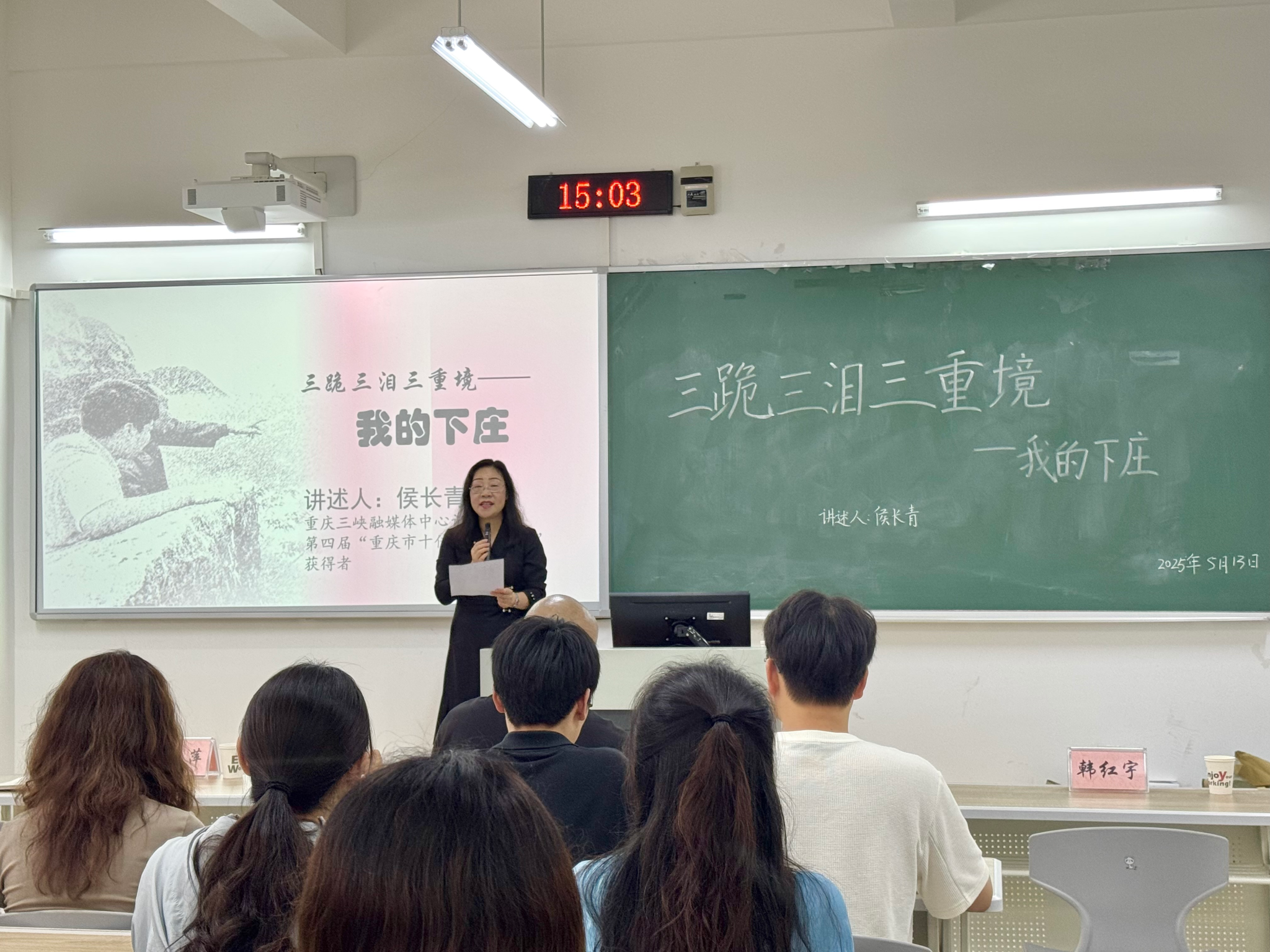 2025年5月13日下午,“重庆市十佳新闻工作者”、三峡传媒集团首席记者侯长青应三峡研究院邀请,在博学楼1栋206教室,为太阳成集团tyc7111cc与传媒公司师生开展专题讲座。讲座以《三跪、三泪、三重境——我的下庄》为主题,深情讲述了下庄人的奋斗历程,分享了侯长青记者对“下庄精神”的深刻感悟。公司党总支书记唐晓萍主持活动,90余名研究生参与交流。