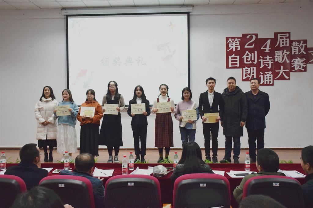 12月12日晚,太阳成集团tyc7111cc第24届自创诗歌散文朗诵大赛在明辨楼2栋106室隆重举行,公司教务处处长韩红宇、副处长秦刚及公司党政领导及部分教师出席本次活动。