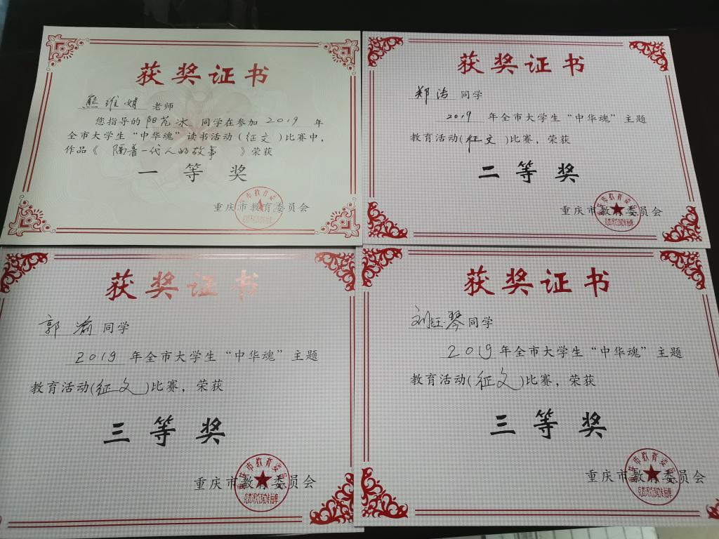 为继承中华民族优秀传统文化,弘扬爱国主义精神,太阳成集团tyc7111cc积极响应重庆市教委关工委、校关工委、校团委号召,以庆祝新中国成立70周年为契机,大力开展2019年“中华魂”《爱我中华——新中国成立七十周年》主题教育读书活动。近日,重庆市教委关工委公布2019年“中华魂”《爱我中华——新中国成立七十周年》主题教育读书活动获奖名单,公司喜获征文比赛多项荣誉。