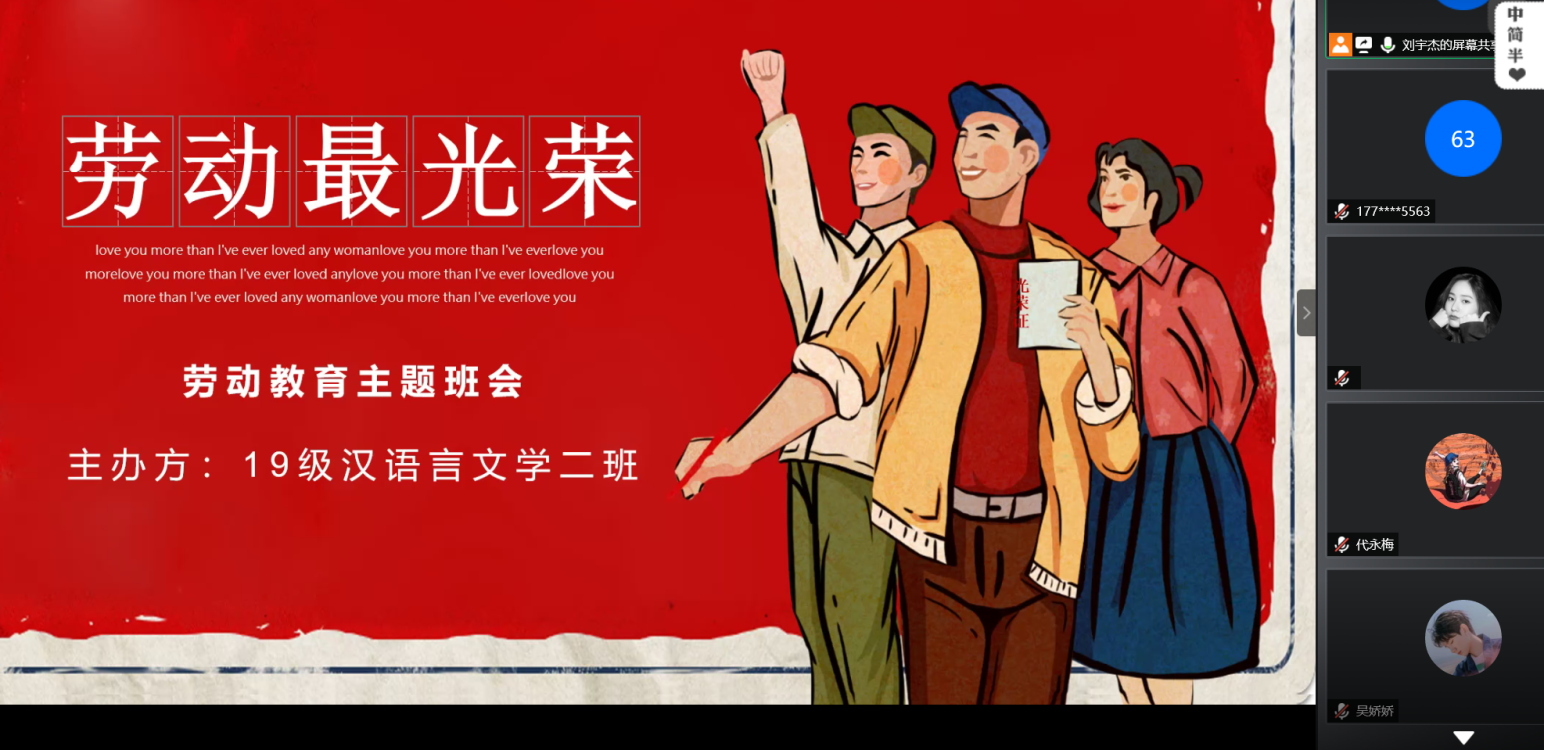 为贯彻落实《关于全面加强新时代大中小学劳动教育的意见》和公司《关于进一步在本科员工中开展劳动教育的通知》精神,让同学们树立正确的劳动观念和劳动态度,热爱劳动和劳动人民以及养成劳动习惯,11月1日至6日,公司2019级各班陆续开展了“劳动最光荣”线上主题班会。