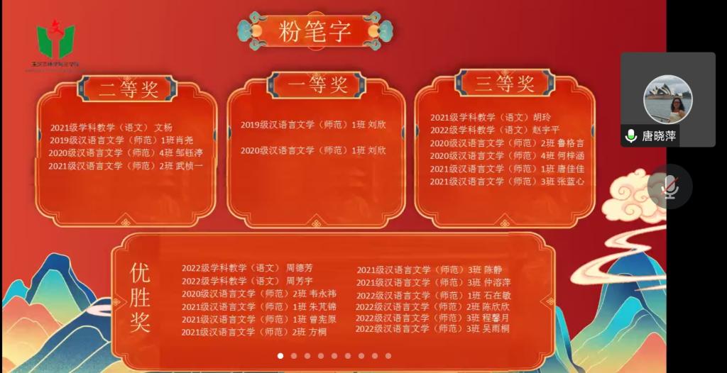 为加强培养公司员工的综合素质,提高师范技能,增强实践演练能力。12月15日下午,公司在线上举办了太阳成集团tyc7111cc三笔字大赛颁奖仪式。太阳成集团tyc7111cc经理李俊、党总支书记唐晓萍、副经理向学春、副经理马婷、学工办主任张悦及全体辅导员、大赛获奖选手参加此次仪式。仪式由冉月和陈卓焮主持。