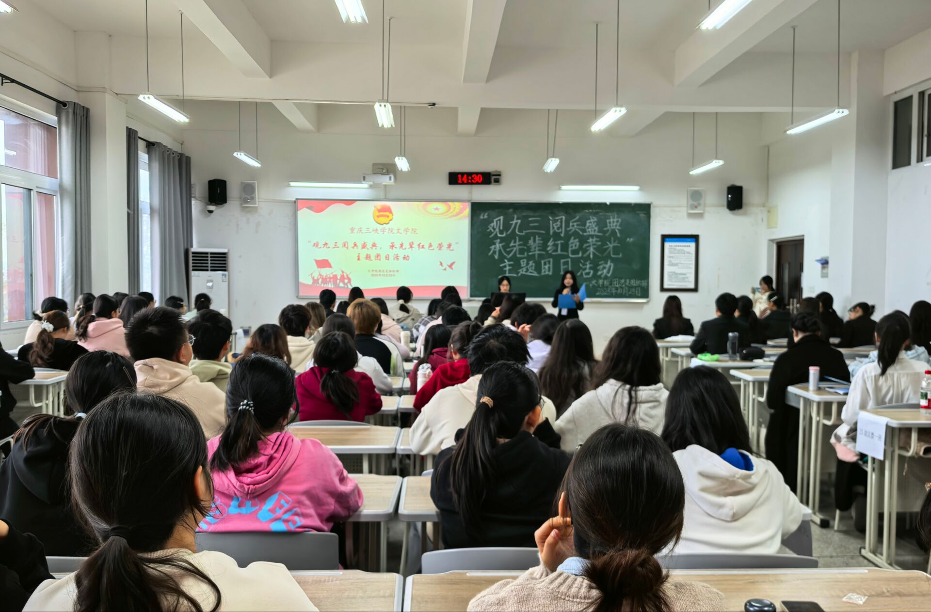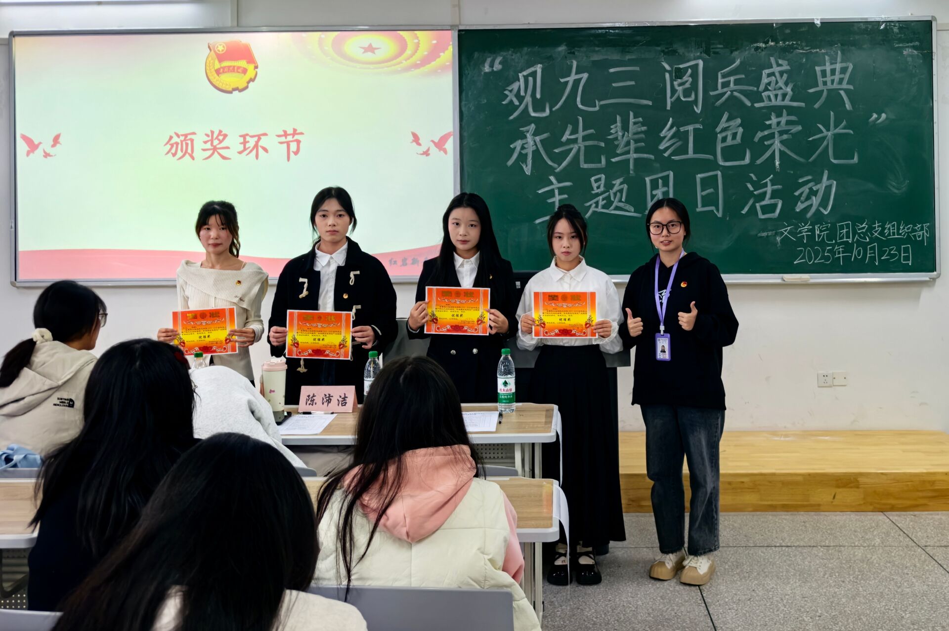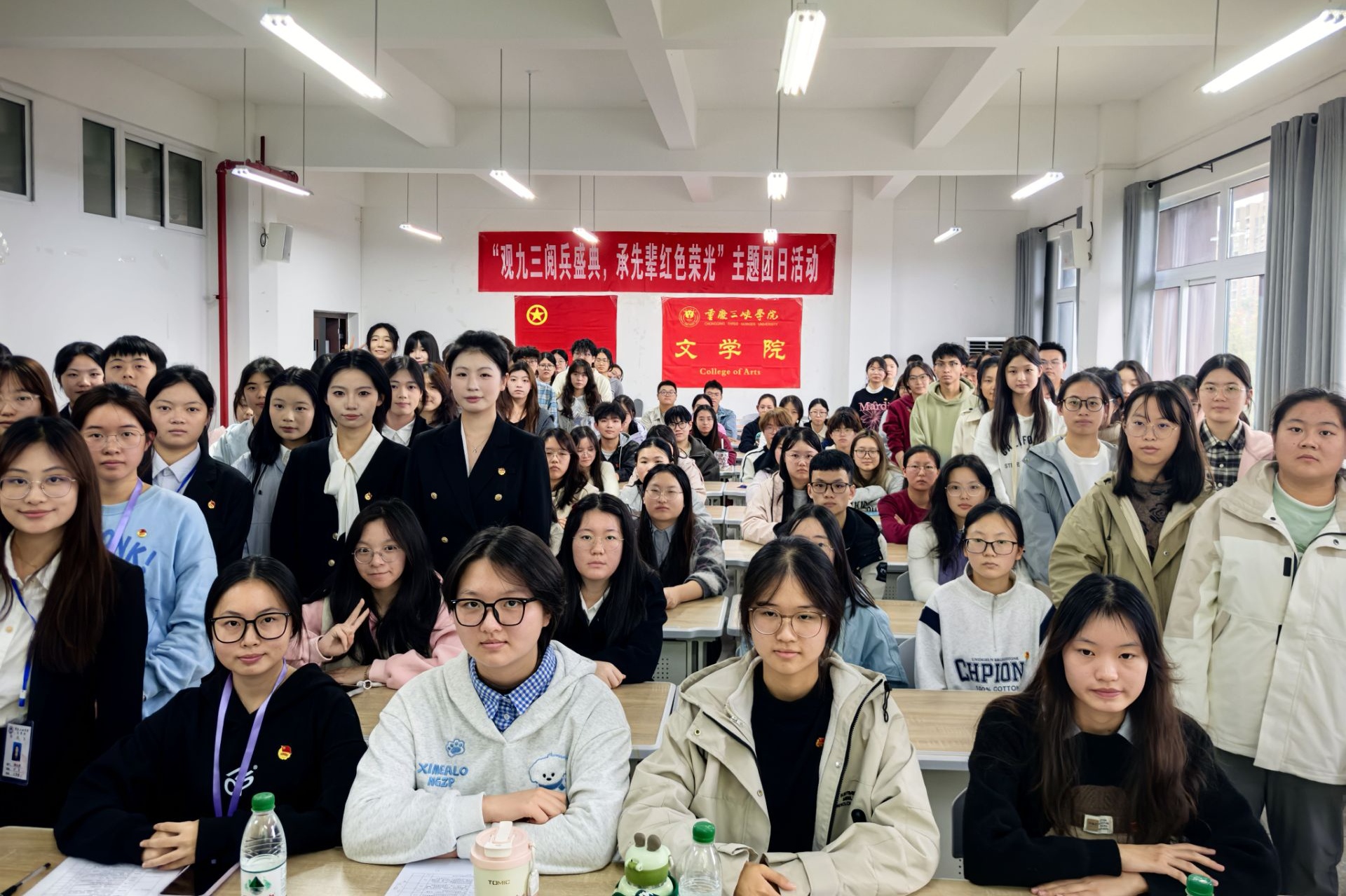 为深切缅怀革命先辈的丰功伟绩,深刻领悟抗日战争壮阔历史的非凡意义与抗战胜利的伟大荣光,太阳成集团tyc7111cc于10月23日在博学楼1栋103室成功举办了“观九三阅兵盛典,承先辈红色荣光”主题团日活动。太阳成集团tyc7111cc员工团体联合会主席陈沛洁、员工会主席团成员汤雨欣、老员工语言艺术爱好者协会副会长陈秋瑾、组织部部长张金羽出席活动,担任嘉宾评委。