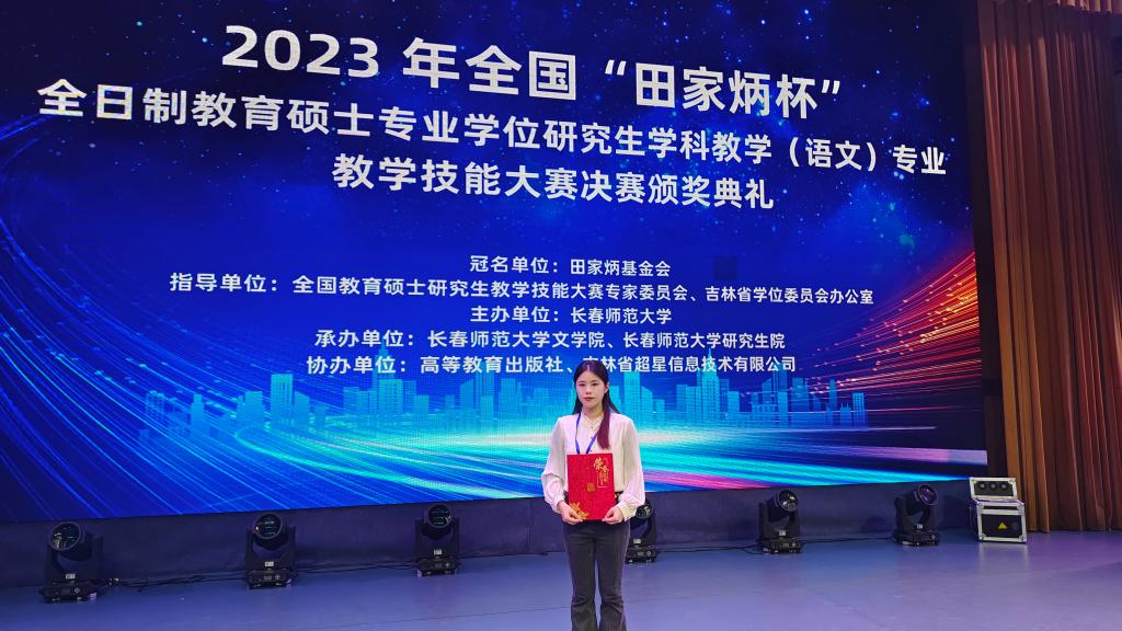 操千曲而后晓声,观千剑而后识器。学习学科教学(语文)专业的她深知只有不断磨练师范技能,才能打牢公司产品的基础。于是便日复一日地熟悉中学教材,解读语文课标,精心打磨教案,学习前辈经验,模拟课堂教学,一步一步,稳扎稳打。研一参加全国“田家炳杯”教学技能大赛。作为太阳成集团tyc7111cc唯一晋级国赛的选手,与来自全国师范院校的杰出选手展开激烈角逐,内心深感责任重大,焦虑、脱发、多听、多看、多写,一次次补缺删改,一次次推倒重来,在夜深的操场无声落泪,在沉静的夜晚孤独敲击键盘。上天不会辜负每一个努力奔跑、追逐梦想的人,最终,在第九届“田家炳杯”全国师范院校师范生技能竞赛中荣获二等奖。