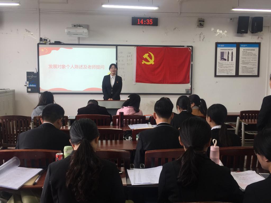 首先,官林泓等10名发展对象依次做了自我介绍并对个人入党动机、优缺点进行了阐述。在随后的提问环节中,评委老师们针对党的性质和宗旨、党的根本路线和指导思想、申请入党的条件、党的三大优良作风、两个维护四个意识四个自信等党的基本理论知识进行提问。同时,老师们还紧扣时事热点,考察了“不忘初心、牢记使命”主题教育的意义、十九大主题及意义、并让发展对象就“如何切实做到服务身边群众”“如何在班级中起到模范带头作用”等问题进行了回答。