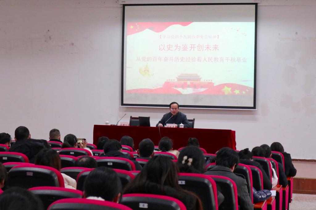 李廷勇从党的十九届六中全会精神热点解读和从中国共产党百年奋斗历史看人民教育千秋基业两个方面进行讲解。带领大家回顾了“两个一百年”奋斗目标的宏伟蓝图,从新民主主义革命时期、社会主义革命和建设时期、改革开放和社会主义现代化建设时期、中国特色社会主义新时代四个历史时期追溯党的光辉历程,解释了中国共产党为什么能够带领中国发展的深刻道理。李廷勇详细解读了《中共中央关于党的百年奋斗重大成就和历史经验的决议》与党的前两次决议之间的关系,重点指出中国共产党始终把为中国人民谋幸福、为中华民族谋复兴作为党的初心使命,并通过十个历史经验对习近平总书记提出的教育综合性改革进行阐述,希望所有师生应全面贯彻党的教育方针,明确教育的根本任务,弘扬中国传统文化,走符合中国国情的且切合中国实际的教育发展道路,努力办好人民满意的教育。