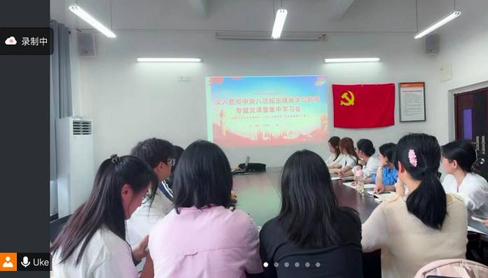 其次,周子钦带领大家重温了中央八项规定的主要内容。她逐条解读,深入浅出,让全体同志深刻理解了中央八项规定精神的核心要义和实践要求。同时,列举出习近平总书记在十八大之后第一次离开北京考察深圳时,以自己的实际行动践行中央八项规定的事例。同志们纷纷表示要严格遵守中央八项规定,发挥好先锋模范作用。